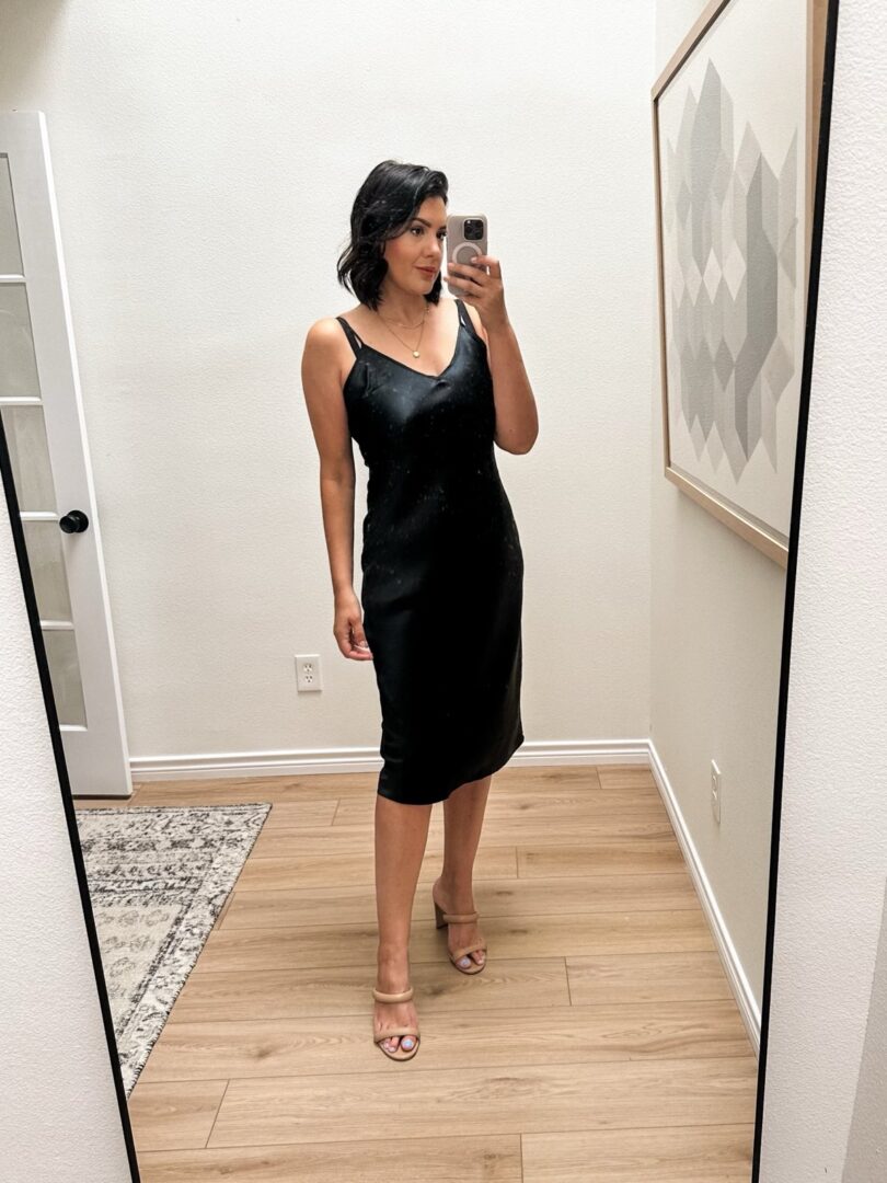If you are looking for a silk dress option, this one is a great find. The fabric is a touch thicker than their skirts and keeps its shape well. I’m in the large, perfect fit for 8/10. Find it on sale here!