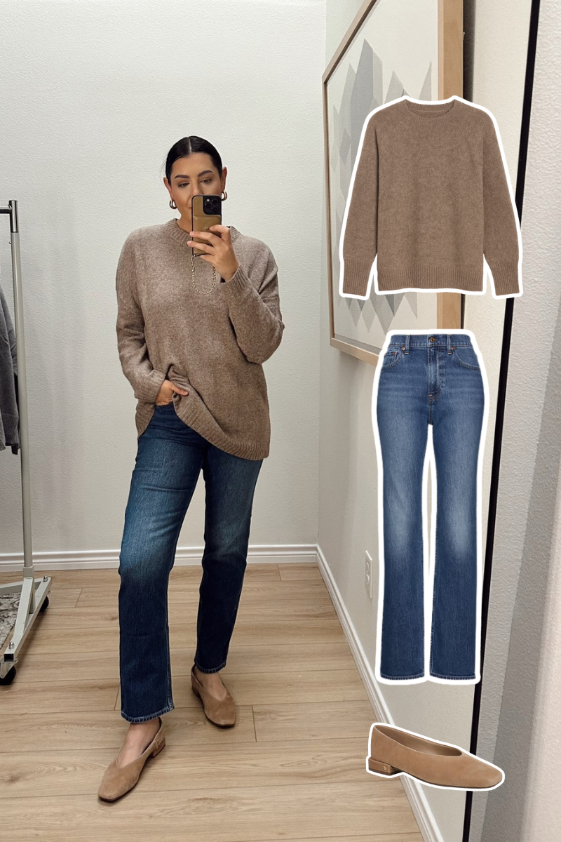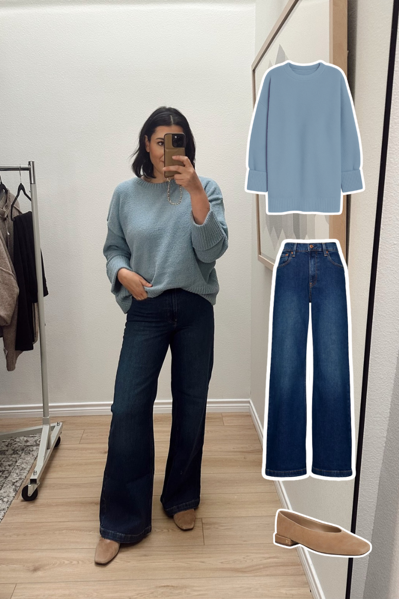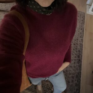 This is a sweater I’ve had before and absolutely loved. I was looking for it the other day and sadly realized I sold it in my pre-loved shop. I remember that it was a touch too big, so I re-ordered it in the medium and love this color and fit. What I love the most about this sweater is the feel of the fabric — it feels like a barefoot dreams blanket. It’s so soft and cozy, a real delight to wear. It runs generously, so keep that in mind. This is the medium and it’s a looser fit overall. (I wore it in my January 2023 capsule in the navy!)