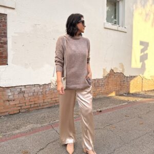 This sweater I initially was not impressed with. I was expecting it to be a chunkier knit and the knit on this is a smoother, finer knit. But I ended up pairing it with my silk pants out of desperation of trying to find a sweater to pair with those pants and ended up loving the look. I’ve worn the sweater a handful of more times, as it’s a nice weight, I like the crewneck and longer length oh and bonus: it washed out beautifully. (I washed on delicate, laid flat to dry as I do all my sweaters.) Most of the sweaters on this list are longer length, which I find to be the most versatile. This one is lightweight enough I can pull it up and tuck it like above, or wear it long with leggings, like below.