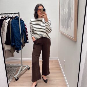 This top is from Nuuly, but it’s Citizens of Humanity via Nordstrom. You can find it here and it DEFINITELY runs big. This is the large and it’s a touch too big for me. Pants are quince and too small for me. But if we average the two of them together, this outfit fits perfectly. (But for real size up on the pants.)