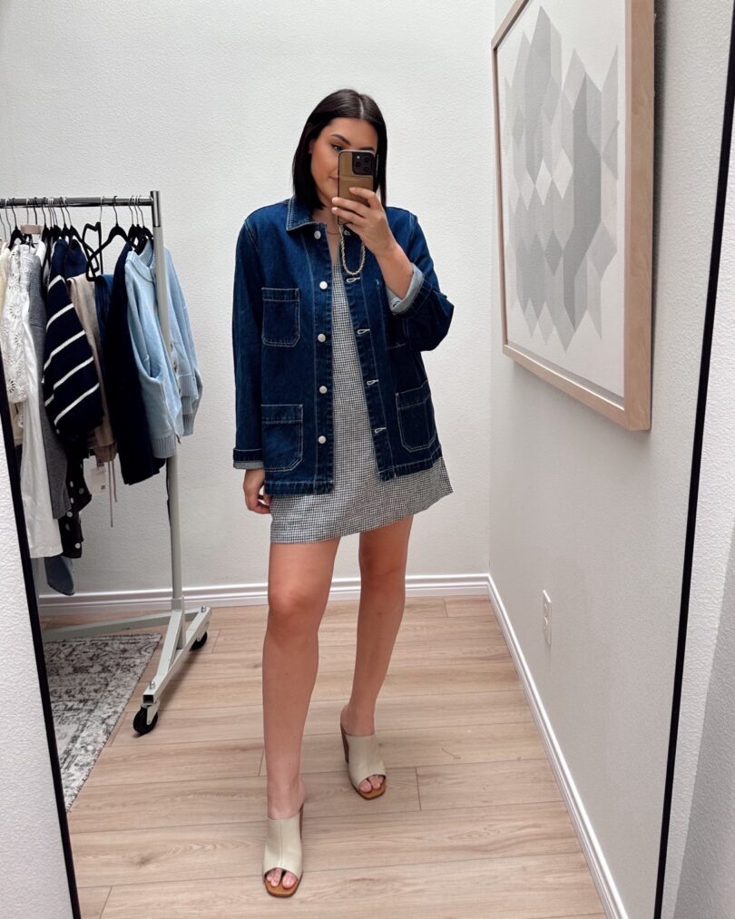 This dress is going to be my go-to this summer. It’s not quite warm enough to go without a jacket or cardigan, but come July I’ll be living in it just like this. This is a linen gingham dress but it does come in solid colors as well. The sewn in lining has shorts underneath and I love it. I’m wondering why we haven’t been doing this for mini dresses! Lined shorts are the new pockets for me. I am in the large for length and overall it’s a bit big. I’d say it’s a generous fit overall.