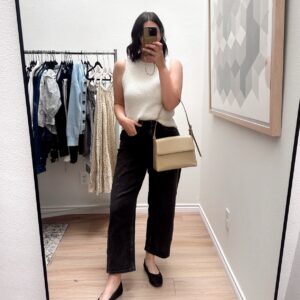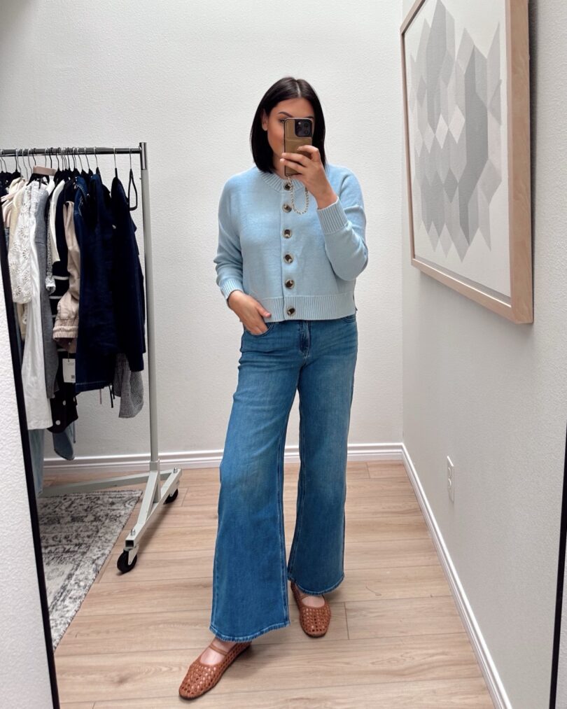 This is another favorite sweater from Quince! I swear I don’t love everything from there but I do like their sweaters. I especially like their 100% cotton sweaters, really nice weight + always under $50. I loved this light blue for spring. I usually size up in this sweater so it’s less cropped, but I went TTS (medium) for spring because I wanted a shorter length. It runs TTS but relaxed and boxy. If in between sizes, you could go down a size.