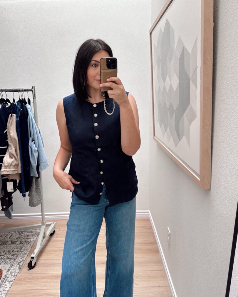 I feel like Quince really thrives with natural fibers like cotton, linen and their cashmere. I love most of their linen pieces, especially their more tailored ones like this vest. I have this vest in black and navy! It’s a softer linen that moves beautifully, not stiff at all. I am in the large for extra wiggle room at the chest, overall I find it runs TTS.