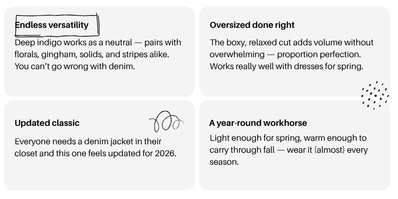 The denim chore jacket has been quietly cool for decades, but I feel like it’s been overlooked until the last few years. This one is from Quince and I love the oversized, dark-wash option. (The light blue has a more casual feel but is a good one too!) I just like that the dark denim creates instant contrast and grounds any look. I love a denim jacket but haven’t been drawn to the typical trucker style or tailored denim jacket the last few years. This denim chore one solves the gap that my typical denim jacket left. I don’t think you can go wrong with any color, just find the one that works best in YOUR wardrobe! For me, this spring at least, it’s this dark rinse. Under $100 and such a good find.