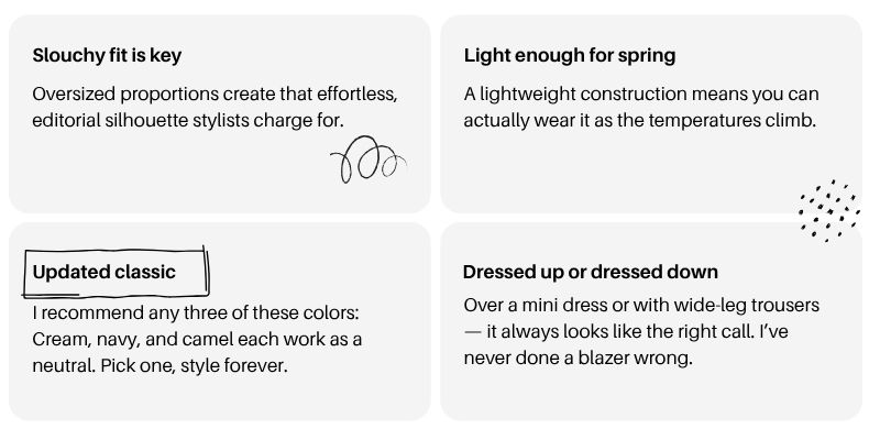 The key is the fit: deliberately oversized, with dropped shoulders, a roomy body, and a hem that grazes the hip. It shouldn’t look *too* tailored — it should look borrowed, effortless, like you grabbed the best thing in the room on your way out the door. In a soft cream, deep navy, or warm camel, it instantly becomes the anchor of any outfit! I like to pair with a simple tee, over a dress, with matching shorts. Sky is the limit, honestly. If I am ever unsure of what to wear, I know it’s an oversized blazer kind of day.